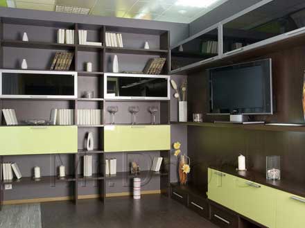 Корпус, полки и откидные фасады нижнего яруса — «Дуб Торонто» эффектно оттеняют откидные глянцевые фасады, выполненные в декоре «Лайм», и рамочные фасады «Джамп» с черной стеклянной вставкой. Средняя полка подсвечена светильниками «Доппио».